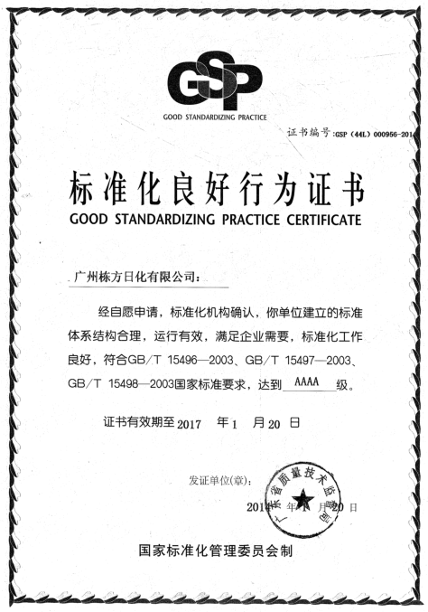 2017年4月20日,廣州市質(zhì)量監(jiān)督檢測(cè)研究院與標(biāo)準(zhǔn)化研究院組織6人評(píng)審組,對(duì)廣州棟方生物科技股份有限公司進(jìn)行了“標(biāo)準(zhǔn)化良好行為企業(yè)”首次復(fù)審。經(jīng)一系列嚴(yán)苛的資料審核、現(xiàn)場(chǎng)確認(rèn)等程序,棟方股份以總計(jì)465的高分(總分500)優(yōu)勢(shì),順利通過專家評(píng)審組的一致確認(rèn),繼續(xù)保持“國家AAAA級(jí)標(biāo)準(zhǔn)化良好行為企業(yè)”的榮譽(yù)稱號(hào)。